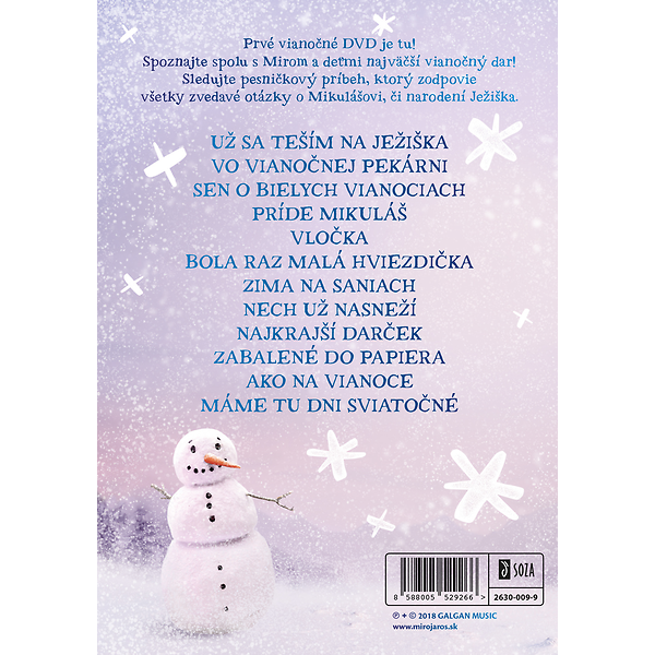 Na Slovensko prichádza prvé vianočné DVD, ktoré prináša Miro Jaroš! Spoznajte spolu s ním a deťmi najväčší vianočný dar. Sledujte pesničkový príbeh, ktorý zodpovie všetky zvedavé otázky týkajúce sa Mikuláša či narodenia Ježiška. Spolu s Mirom si zaspievate už známe hity, ako aj nové pesničky o Mikulášovi, alebo o malej hviezdičke, ktorú dospeláci poznajú zo Zlatej brány (Bola raz malá hviezdička). Jedinečné DVD je určené malým aj veľkým. Ideálny darček pre celú rodinu.