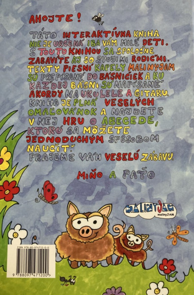 Anotácia: Táto interaktívna kniha nie je určená iba Vám milé deti. S touto knihou sa spoločne zabavíte aj so svojimi rodičmi. Obľúbené texty piesní kapely malinyJAM sú prepísané do básničiek a ku každej básni sú napísané akordy na ukulele a gitaru. Kniha je plná veselých omaľovánok a nájdete v nej hru o Abecede, ktorú sa môžete jednoduchým spôsobom naučiť. Prajeme Vám veselú zábavu. Miňo a Paťo